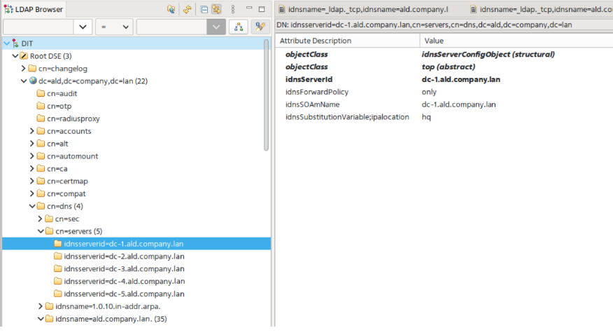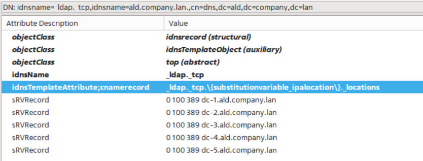 Для привязки серверов к локациям у дочерних записей DN cn=servers,cn=dns,dc=ald,dc=company,dc=lan задано значение атрибута idnsSubstitutionVariable;ipalocation, соответствующее имени сайта, в котором этот сервер находится.