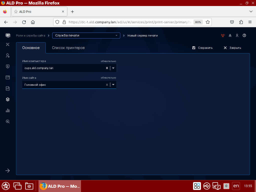 В портале управления в разделе Роли и службы сайта → Служба печати на вкладке Серверы печати открыть карточку для добавления сервера, нажав на кнопку [Новый сервер печати], см. Добавление сервера печати.